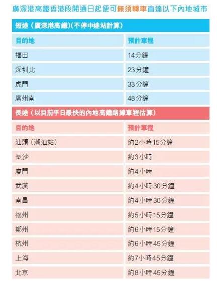 香港高铁开通后,乘客无需换乘可直达以上内地城市;内地乘客亦可直达香港,无需中途下车过安检。