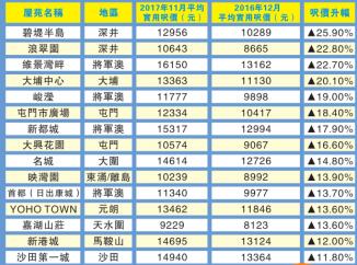 劉嘉輝又稱,隨着樓價上升,呎價萬元或以下屋苑數目由2016年12月的12個減少至2017年11月的4個,則分別為屯門「豫豐花園」、荃灣「荃威花園」與「豪景花園」及天水圍「嘉湖山莊」,當中「豪景花園」實呎更低於9000元。此外,「首都」、「峻瀅」、「愉景灣」、「慧豪園」、「麗城花園」、「大興花園」、「映灣園」及「浪翠園」於2017年11月平均實呎已達萬元水平