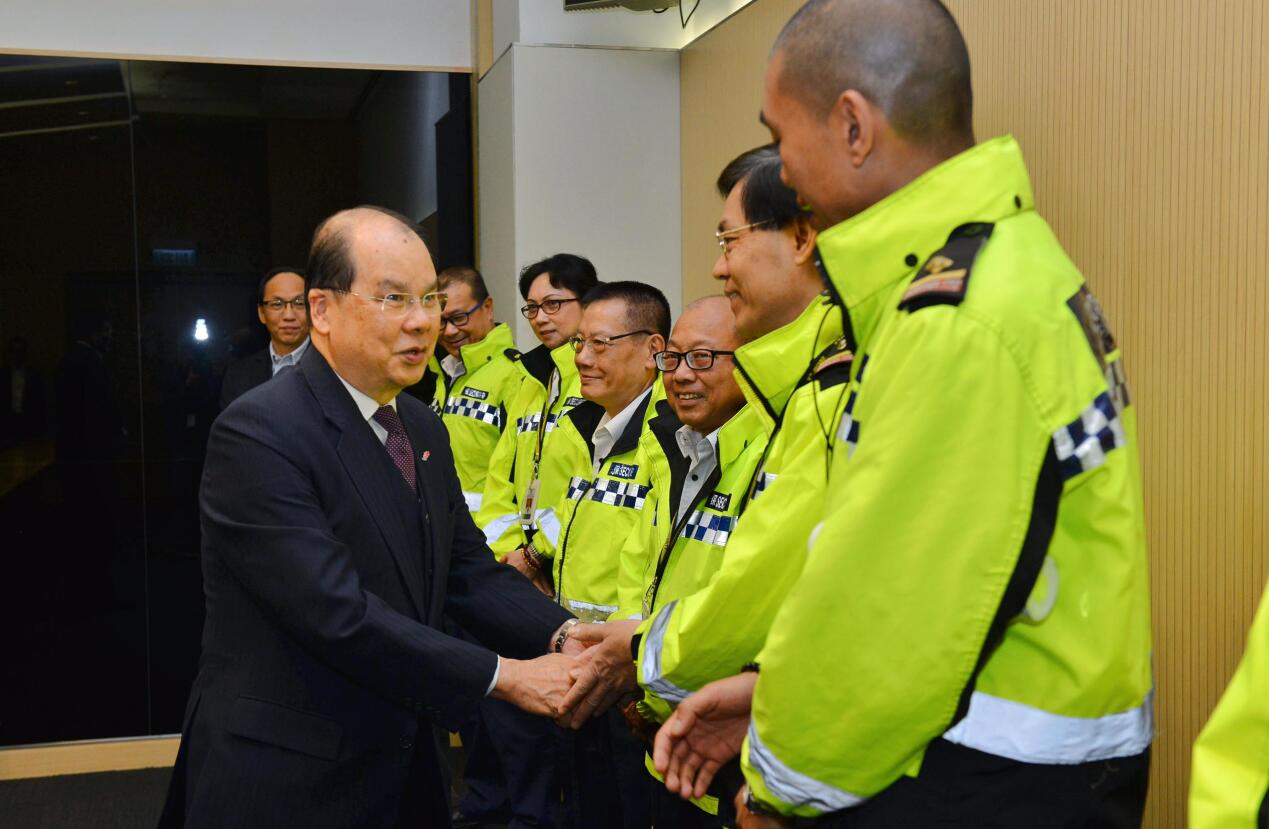 張建宗(左)昨與政府總部保安員會面,感謝他們一直盡忠職守,以專業態度協助維持政府總部的秩序。