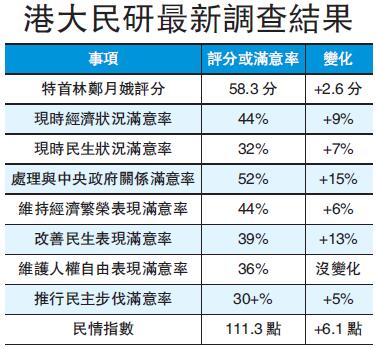 另外,民情指數方面,最新數字為111.3,較12月中旬上升6.1點。今次民情指數的兩個成分數值同時上升,反映市民對整體政府管治表現評價的政評數值上升1.8點至109,而反映市民對整體社會狀况評價的社評數值則上升9.2點至104.1。