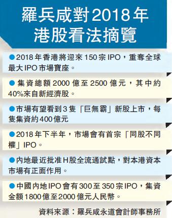 多宗大型首次上市活動延遲至2018年,市場有望看到3隻「巨無霸」新股上市,每隻集資約400億元。「同股不同權」架構將於下半年實施,屆時市場會有首宗「同股不同權」IPO,能符合要求的企業市值都不低。另外,內地最近批准H股全流通試點,對本港資本市場有正面作用。