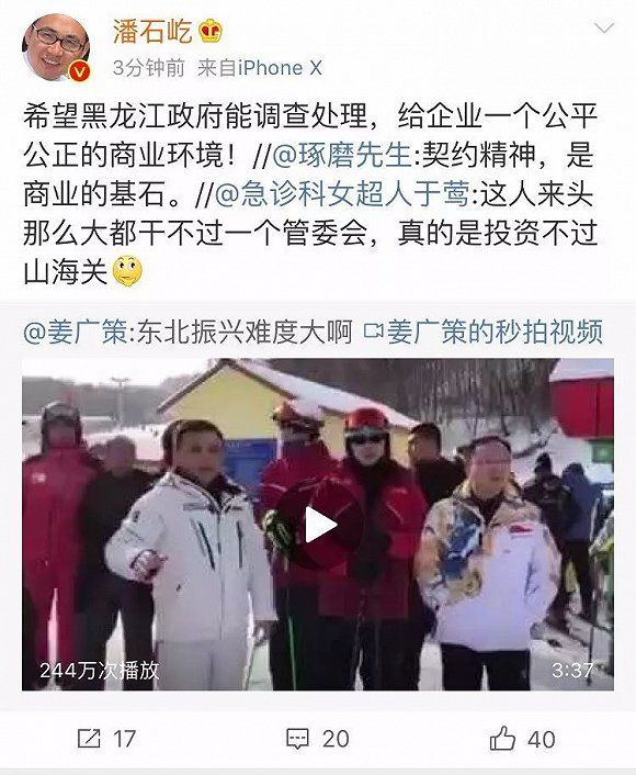 而在視頻發出後,不少人感慨視頻再次印證了「投資不過山海關」這一說法。SOHO中國董事長潘石屹連發3條微博支持毛振華,稱他是一位站在陽光下的企業家,並表示「希望黑龍江政府能調查處理,給企業一個公平公正的商業環境。」