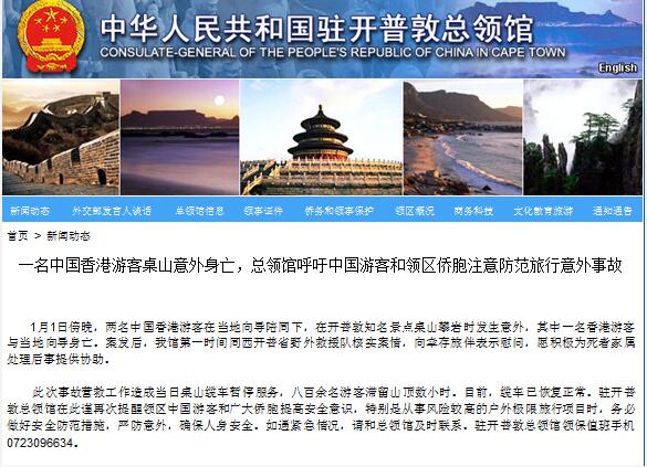 【香港商报网訊】中國駐南非開普敦總領館網站發布消息稱,當地時間1月1日傍晚,兩名香港遊客在南非嚮導陪同下,在開普敦知名景點桌山(Table Mountain)攀岩時發生意外,其中一名香港遊客與嚮導身亡。