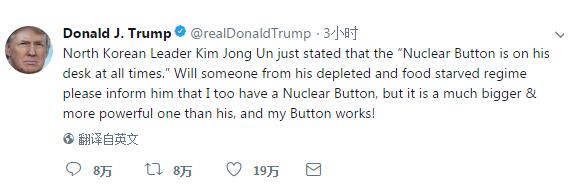 【观察者网综合报道】新年朝韩互相释放善意。不过,当地时间1月2日,美国总统特朗普再次发推喊话朝核问题时的重点还是为了另一句话。他称,朝鲜领导人金正恩说桌上有核按钮,麻烦请转告他,“核按钮我也有,比他的更大、更厉害,而且真的有用!”