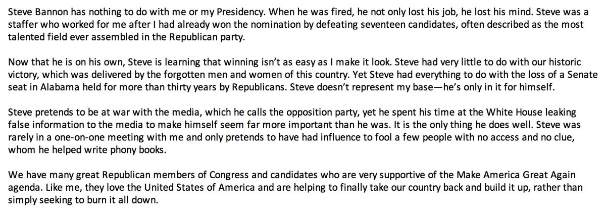 史蒂芬·班农与我或我的总统职位毫无关系。当他被解雇时,他不仅丢了工作,也失去了理智。他是在我击败了17名其他候选人并赢得提名后才为我工作。而我的那项胜利可算得上是共和党有史以来最大的一次成功。