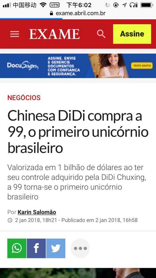 巴西是全世界增长最快的移动互联网市场。此次交易是巴西科技界一次里程碑式的并购;显示了共享出行行业的发展动能,也印证了巴西科创业的巨大潜力。