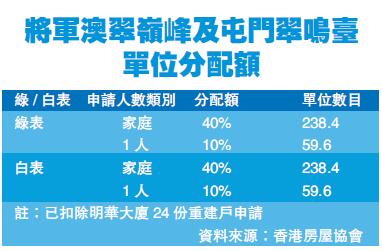 今次申請當中,一人申請者有58484份(62%),整體約60%申請人年齡為18至30歲。楊嘉康續說,兩個項目合共有620個單位,而明華大廈有24份重建戶申請。在扣除他們成功選購的單位后,其餘單位將以綠白表各一半分配,而整體中各一成將留給一人申請者(詳細分配請見附表)。若扣除重建戶申請,兩項目餘下594個單位供揀選,白表申請者為293:1,綠表申請者約為20:1。