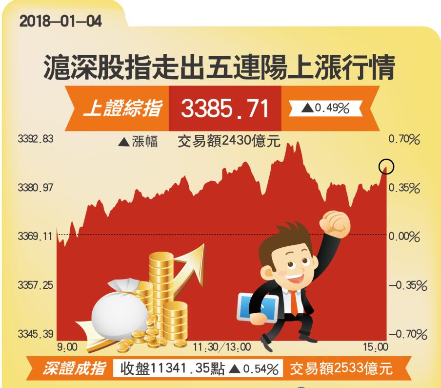 當日上證綜指以3371點開盤,油服板塊受到油價大漲的影響表現活躍,加之半導體板塊捲土重來,主板指數逐漸震盪走強,午後市場略顯分化,二線藍籌持續回升,中小創較為萎靡,尾盤自由貿易港板塊集體衝板。全天走勢高於前一交易日收盤,最終收報3385.71點,較前一交易日漲16.60點,漲幅為0.49%。深證成指收報11341.35點,漲61.05點,漲幅為0.54%。