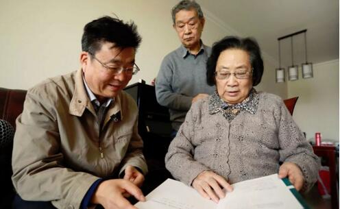 屠呦呦(右)向记者介绍青蒿素相关文献。新华社记者孟菁摄