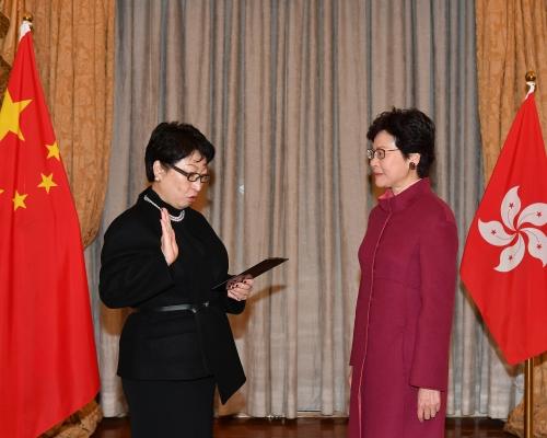 【香港商報網訊】國務院昨日公布任命鄭若驊為律政司司長,今日起生效後,今日履新的鄭若驊早上返回位於下亞厘畢道的律政中心上班前,先到禮賓府,在行政長官林鄭月娥監誓下宣誓就職,並簽署誓言。鄭若驊昨日見記者時表示新崗位是榮譽、也是挑戰,自己會盡己所能,以專業知識和經驗貢獻社會。