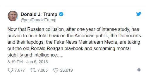 特朗普在推特中说:“经过一年的集中调查,‘通俄门’已经被证明是一场骗局,民主党和他们的走狗,假的主流新闻媒体,正在拿着旧的罗纳德·里根的剧本叫喊,说我的精神不稳定,并且说我的智力有问题……”