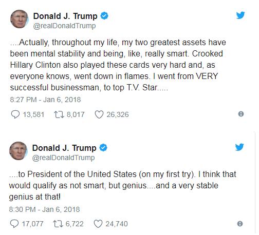 【香港商報网訊】當地時間5日,爆料特朗普白宮生活的新書《烈燄與怒火》正式發售,書中指白宮不少高官都質疑特朗普的能力。作者迈克尔·沃尔夫(Michael Wolff)以多名白宫高官为消息源,对特朗普的精神状况是否合适担任总统职务提出质疑。特朗普于当地时间6日进行了回击,对于“他在智力和情感上不适合成为美国领袖”的指责,特朗普在推特上说,“我的两大资产就是:精神稳定,而且非常聪明。”