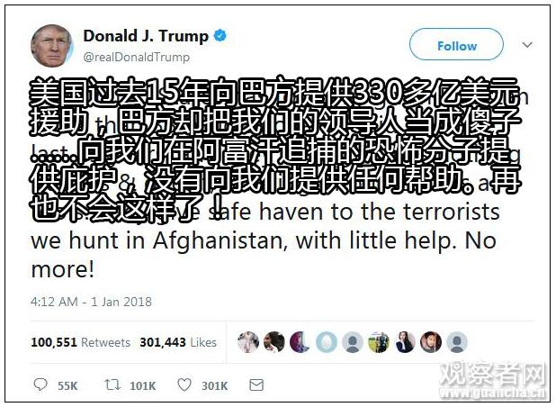 这是双方对自年初以来“口水战”不断升级后的最终回复。年初,特朗普把新年“第一推”献给了巴基斯坦,指责巴方“只有欺骗和谎言,把美国耍得团团转”。