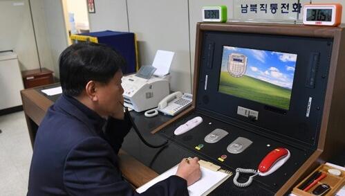 资料图片:韩方板门店联络官与朝方通话。(韩联社/韩国统一部提供)