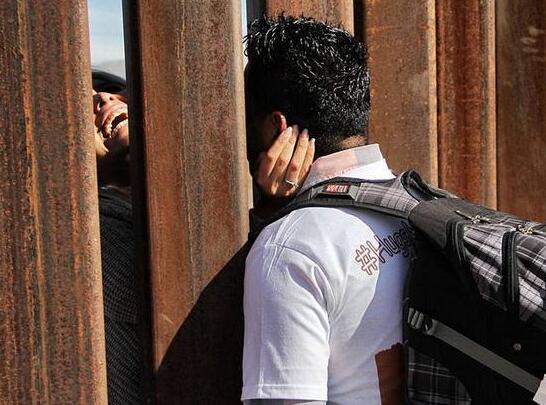 2017年12月10日,墨西哥美国边境,一对新婚夫妇隔着隔离墙拥抱。(新华/法新)