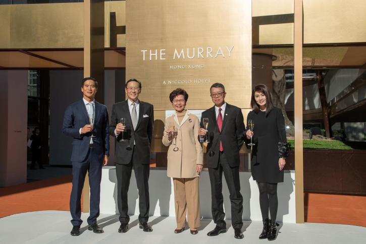 早前特首林郑月娥(中)出席The Murray酒店落成揭匾儀式。