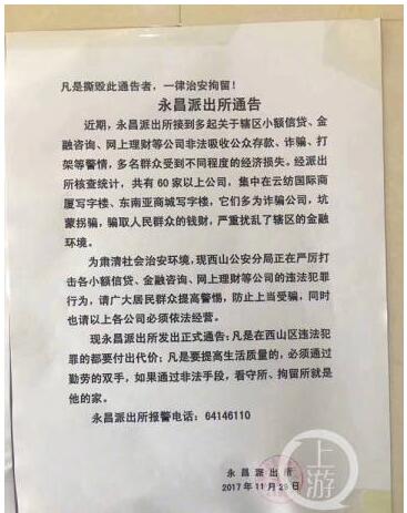 为维护辖区治安稳定,防止不明真相的群众落入非法小贷的陷阱,避免人们上当受骗,永昌派出所于2017年10月份在云纺商业区开展宣传工作,粘贴通告,但相关通告屡屡被人撕毁。