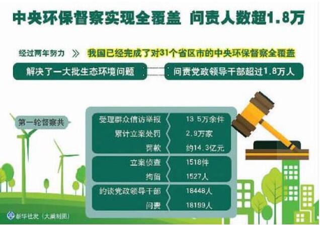 其力度首先体现在问责人数众多。据环保部介绍,首轮环保督察共受理群众信访举报13.5万余件,累计立案处罚2.9万家,罚款约14.3亿元;立案侦查1518件,拘留1527人;约谈党政领导干部18448人,问责18199人。