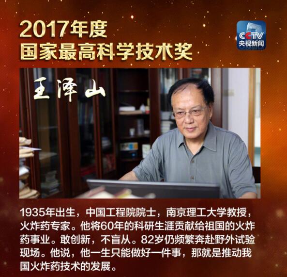王泽山曾于1993年获得国家科学技术进步奖一等奖,又于1996年和2017年两次摘得国家技术发明奖一等奖。自诩为“80后”的他头脑灵活、精力充沛,依然奋战在国防科研事业第一线。