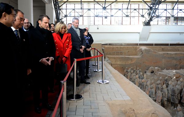 法國總統馬克龍與夫人布麗吉特參觀秦始皇帝陵博物院一號兵馬俑坑。新華社