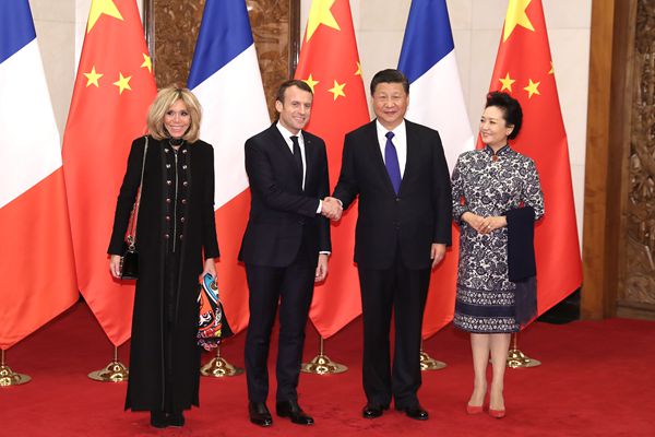 習近平主席夫人彭麗媛,中共中央政治局委員、國務委員楊潔篪和馬克龍總統夫人布麗吉特等參加會見。
