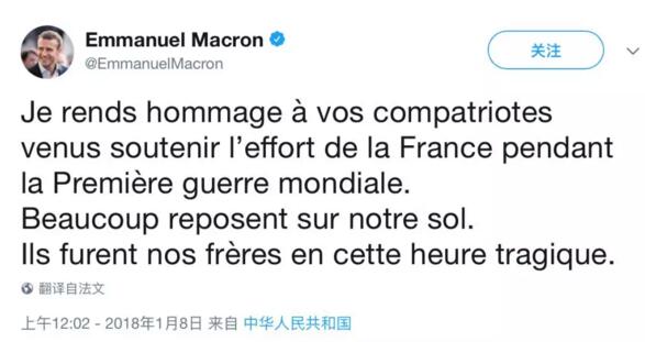 马克龙此行带来了一份特殊礼物——一匹8岁的法国共和国卫队专用马匹,名叫“维苏威”(Vesuvius)。长安街知事注意到,在西安期间,马克龙还“忙里偷闲”发了一个推特,向一战期间支援法国的中国劳工致敬,称他们为“兄弟”。