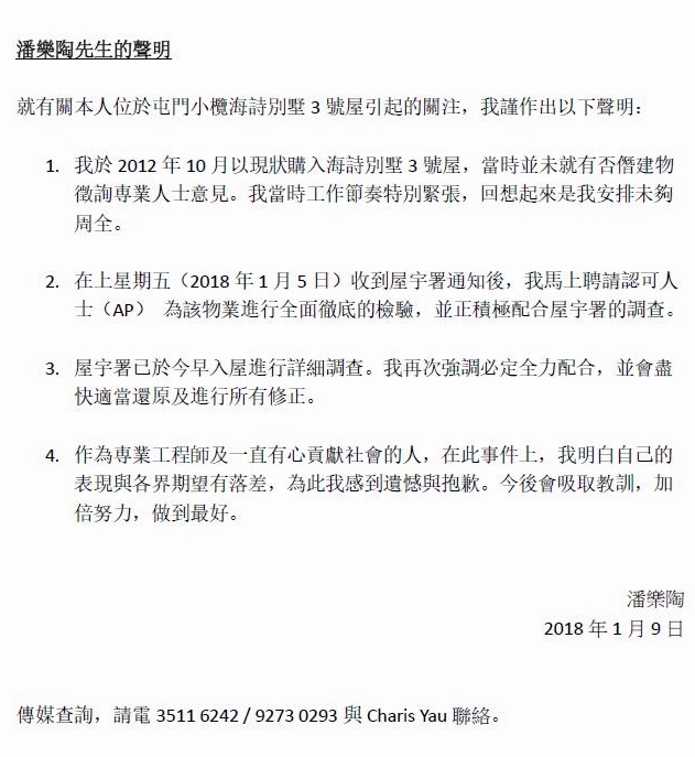 香港工程師學會前會長、安樂工程集團創辦人及董事總經理潘樂陶今日發表聲明,就自己持有的海詩別墅3號屋存在僭建致歉,表示將全力配合屋宇署調查,並盡快修正。