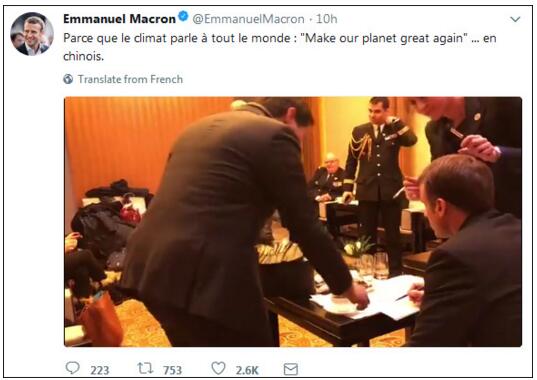 有意思的,马克龙8日还在推特上晒出了自己学习用中文说“让地球再次伟大”的过程,可谓“刻苦”。