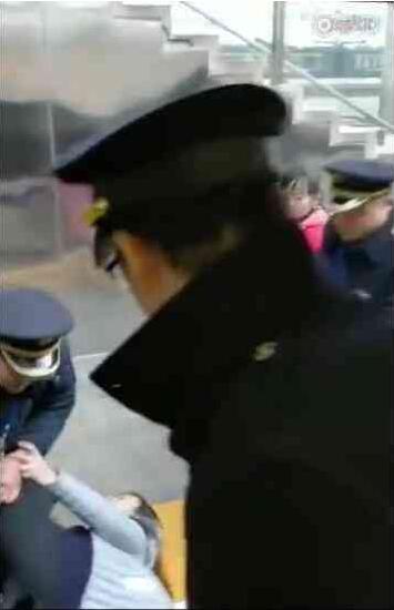 两名执法人员最后采取强硬措施,把她拖到车门外,但她倒地后用脚卡住车门。
