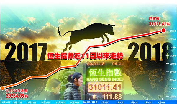 【香港商報网訊】記者吳天淇報道:踏入2018年,港股氣勢如虹——恒指昨日收報31011.41點,10年來首次突破31000點關口,連升11天(累升1777點或6.1%),錄逾18年以來最長升浪,距2007年歷史高位(31958點)僅差不足千點。有分析認為,中美股市造好,港股本月仍有望進一步挑戰新高,惟短期內不排除出現技術性調整。