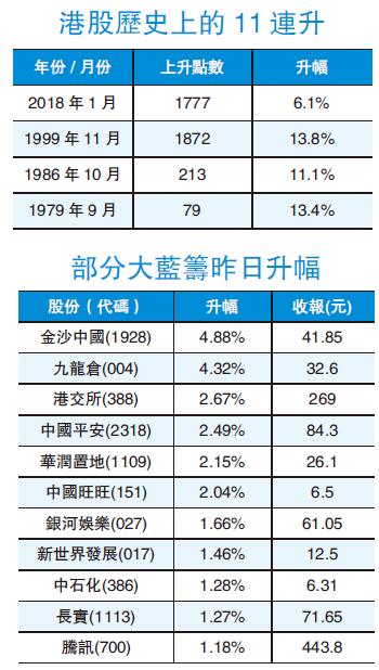 中外資金持續涌入港股下,恒指昨高開33點,一度高見31056點,其后在31000關口反覆上落。全日收報31011點,升111點;國指昨收報12255點,升20點。大市成交則放大至1334億元。至此,港股已連升11個交易日,累計升1777點。若以連升日數計,是為1999年11月以來的最長升浪。