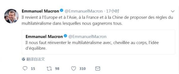 △译文:“现在轮到欧洲和亚洲、法国与中国来制定多边主义的规则,这将使我们实现共赢。”