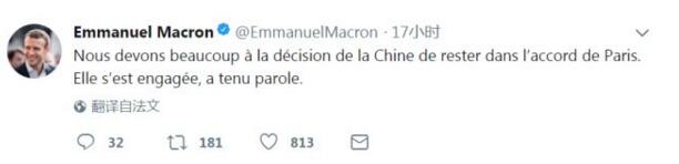 马克龙总统感谢中国在巴黎协议中所起的重要作用。