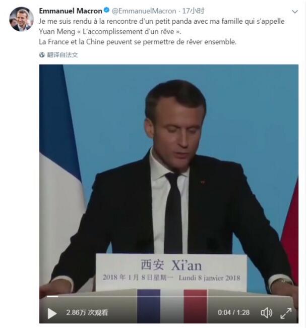 △译文:“我同家人去看过一只叫作“圆梦”的熊猫幼崽,法中两国也可以共同圆梦。”