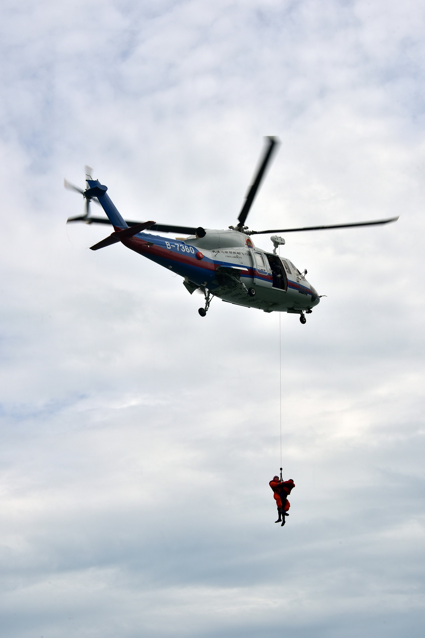 2017年7月9日下午,“海巡01”轮在东海某海域举行海上搜救演习。图为搜救直升机正在救助落水人员。摄影/章轲