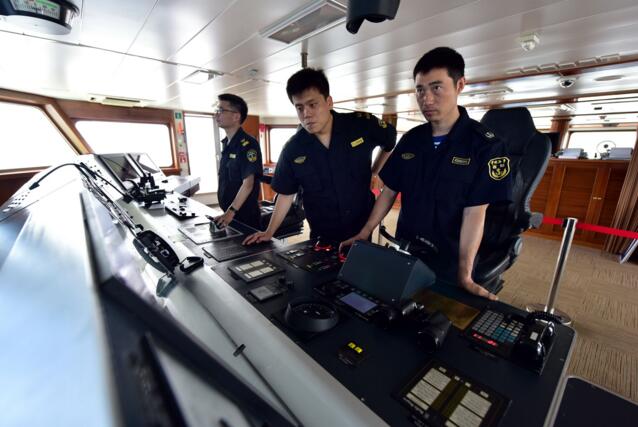2017年7月9日下午,“海巡01”轮在东海某海域举行海上搜救演习。图为“海巡01”轮驾驶台。摄影/章轲