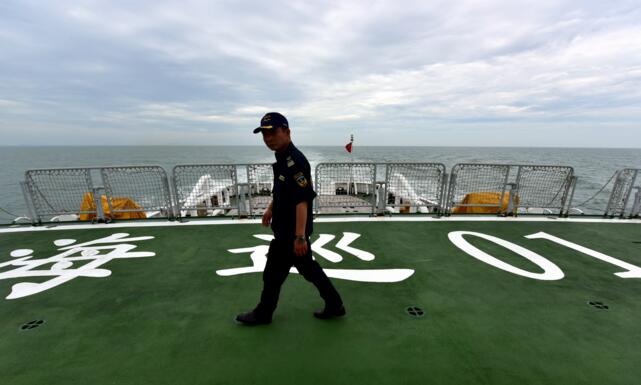 2017年7月9日下午,“海巡01”轮在东海某海域举行海上搜救演习。图为“海巡01”轮直升机起降平台。摄影/章轲