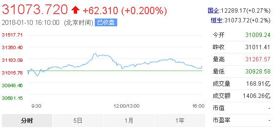 恒指早盘小幅低开0.01%,略微下挫后随即逐步上扬,盘中高见31267点,继创10年新高,距离历史纪录仅一步之遥;全天高位震荡,尾盘有所收敛,截止收盘,恒生指数涨0.2%,报31073点;国企指数涨0.27%,报12289点;红筹指数涨0.18%,报4612点;大市交投保持活跃,全天成交额1406亿,比昨日有所放大,牛市氛围浓厚。