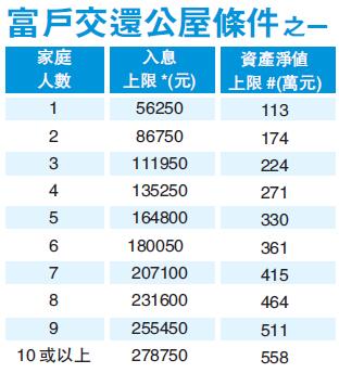 截至去年底,全港共有2.6萬名「富戶」,占公屋住戶數目4%;當中,2.28萬戶繳交倍半净租金,約3100戶繳交雙倍净租金,約60戶繳交市值租金;2012/13至2016/17年度,平均每年僅收回約210個富戶單位。