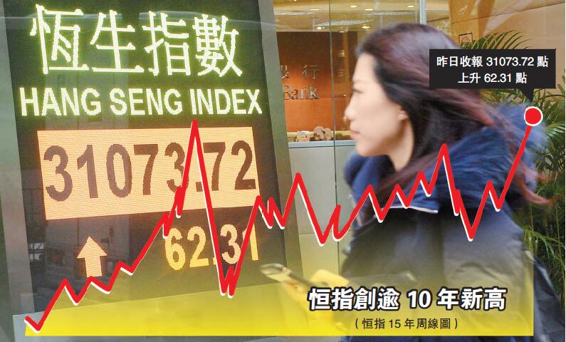 港股昨收市報31073點,升62點,亦創史上最長升浪。中通社