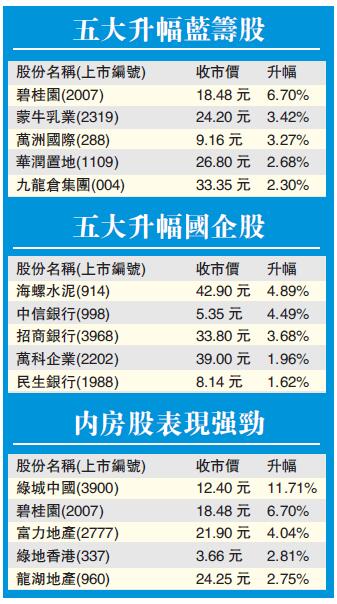 另外,港交所一度高見275元,收市升1%;個別內房股再有炒作,表現最佳藍籌股碧桂園(2007)收市破頂,升逾6%,連同華潤置地(1109)齊創新高。國際油價上升,加上獲大行上調目標價,三大石油石化股造好。另外,內地數據符預期,以及人民銀行重啟逆回購,四大內銀回勇,建行(939)、工行(01398)升不足1%。