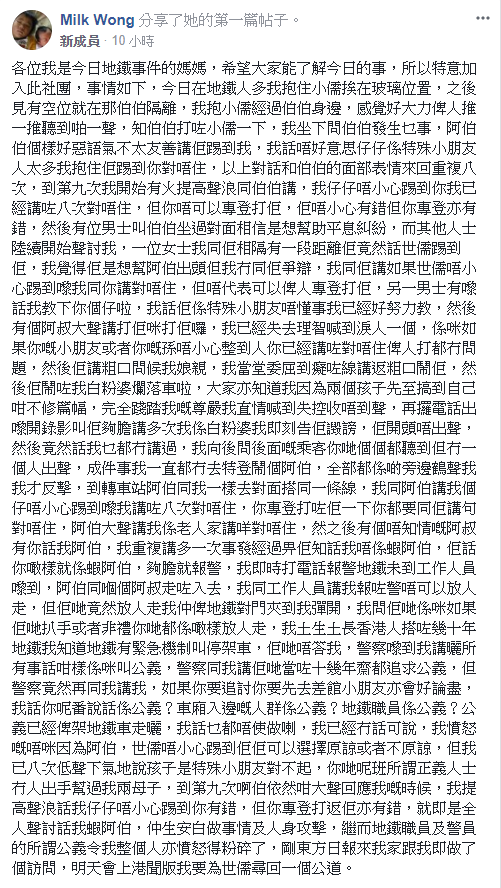 該母親最後指,「公義已經俾架地鐵車走曬」,因無人出手幫過她兩母子,「全人聲討話我蝦阿伯,仲生安白做事情及人身攻擊,繼而地鐵職員及警員的所謂公義令我整個人亦憤怒得粉碎了」。