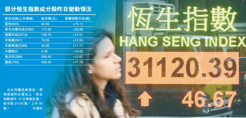 【香港商報網訊】記者吳天淇報道:北水持續追捧滙控(005),帶領港股昨日反覆向上,恒生指數連升13日再創紀錄,收市報31120點,升46點或0.15%。國企指數收報12295點,升6點或0.05%。主板全日成交1288億元,惟北水南下昨出現放緩迹象,港股締結13連升后,動力減弱。