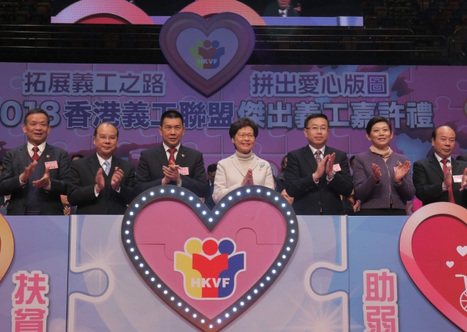 嘉許禮以「拓展義工之路,拼出愛心版圖」為主題。林鄭月娥、中聯辦副主任何靖及特區政府主要官員等擔任主禮嘉賓。他們分別為杰出義工領袖,隊制、青年及個人優秀義工的金、銀、銅得獎者頒獎。