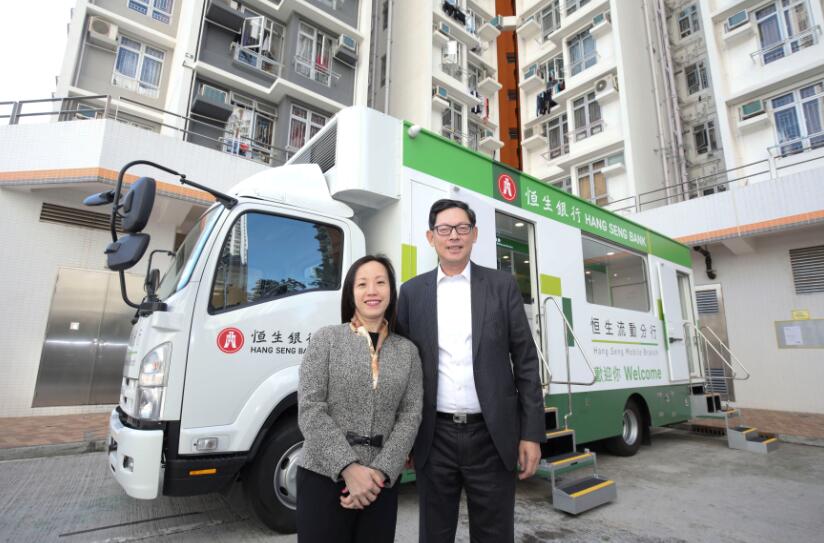 陈德霖(右)与恒生银行副董事长兼行政总裁郑慧敏于流动分行前合照。