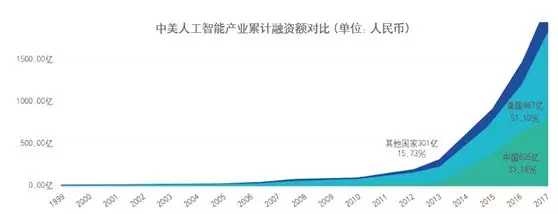 如果我们看下从1999年-2017年上半年,数据来自腾讯研究院,全球各国人工智能产业融资情况,注意是18年的累计融资金额,美国人工智能融资金额为978 亿元人民币,占据全球总融资50.10%;超过全球其他国家总和。