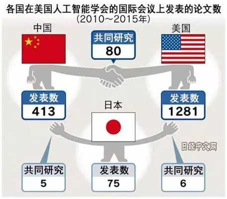 从最具权威的美国人工智能学会的国际会议来看,最近3年来,美国和中国的发表成果出现激增。2015年美国的大学和企业的发表达到326项(48.4%),比例最高,其次中国为138项(20.5%)。两国占整体的约7成。而日本排在第8位,仅为20项(3%)