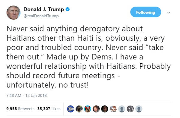 特朗普12日在Twitter上辯稱,他在當天的會議上的確出言強硬,但沒有使用過媒體報道的那個骯髒字詞,也沒有說過「讓他們離開」。他表示,相關言論是民主黨人編造的,他從未說過任何貶損海地人與非洲人的話。