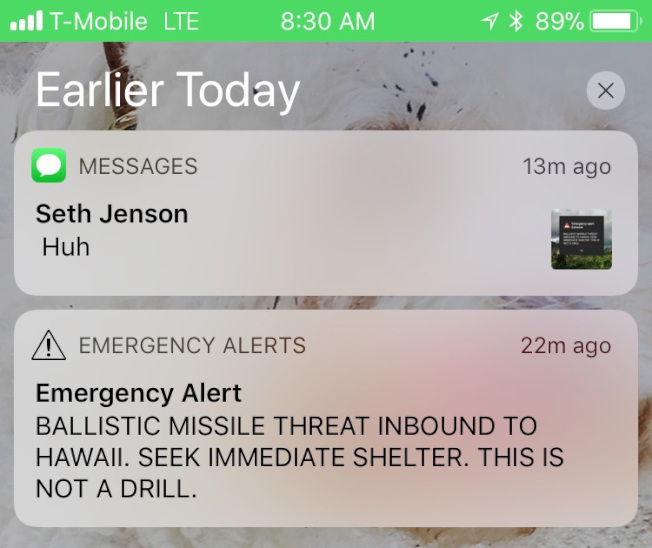 报道称,约20分钟后,夏威夷州紧急事故管理局(Hawaii EMA)透过官方推特澄清,“没有弹道飞弹威胁夏威夷”;到上午8点45分,夏威夷民众则收到手机简讯澄清通知,说明先前发出的第一则警讯是错的,证实是虚惊一场。