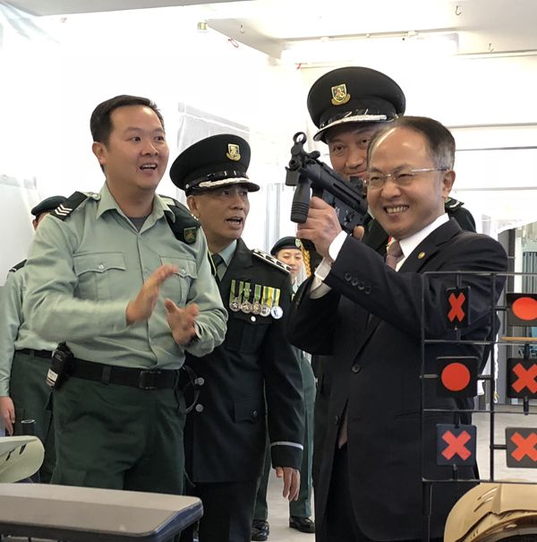 中聯辦主任王志民參觀香港青少年軍總會大樓,並試執訓練用的沖鋒槍。記者葉佩瑜攝